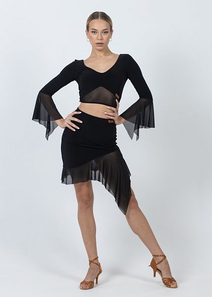 Юбка для танцев с асимметричным воланом из стрейч-сетки. На талии фиксируется резинкой. Юбка выполнена из трикотажа. Для удобства вшиты трусики. К юбке вы также можете подобрать топ или боди из нашей коллекции.